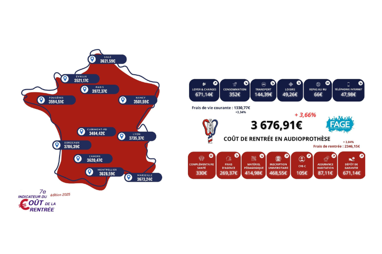 Comme chaque année, la Fédération Nationale des Étudiants en Audioprothèse (FNEA) publie, en partenariat avec la Fédération des Associations Générales Étudiantes (FAGE), son étude sur le coût de la rentrée universitaire. Les chiffres dévoilés mettent en lumière une augmentation significative des dépenses pour les étudiants du secteur.Pour l’année 2025, les dépenses moyennes d’un étudiant non boursier atteignent 3 676,91 €, contre 3 547,06 € en 2024, soit une augmentation de 3,66 %.