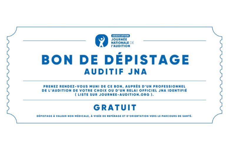 Parce qu’un grand nombre de personnes ne sait pas qu’il est possible de réaliser un dépistage de son audition au sein des services ORL, des centres d’audioprothèses, au sein des centres de prévention santé ou encore auprès des services de santé au travail, la JNA lance le « Bon de dépistage gratuit JNA ». Objectif : lever les freins au dépistage et encourager les Français de tous âges à se rendre dans les relais JNA officiels ou auprès de tout professionnel de son choix.