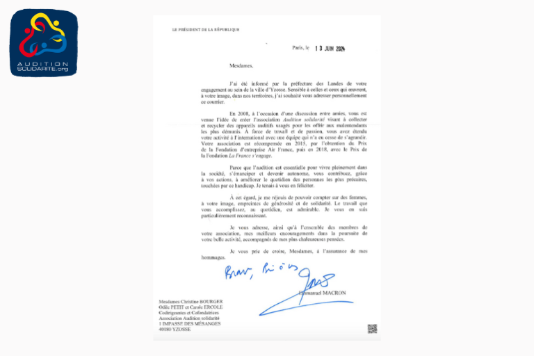 “Sensible à celles et ceux qui œuvrent dans nos territoires”, Emmanuel Macron n’a pas manqué de souligner que “l’audition est essentielle pour vivre pleinement dans la société, s’émanciper et devenir autonome” avant de complimenter les 3 fondatrices pour leur contribution “à améliorer le quotidien des personnes les plus précaires, touchées par ce handicap.
