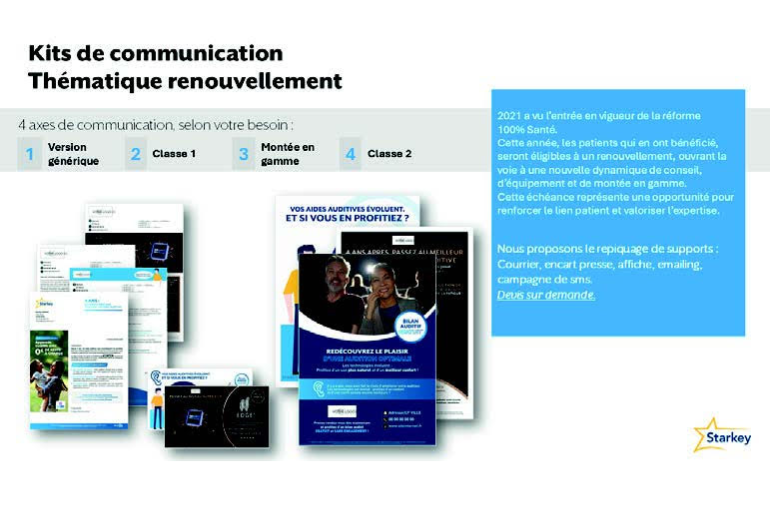 À l’occasion du premier cycle de renouvellement des aides auditives remboursées dans le cadre de la réforme 100 % Santé, Starkey met à disposition des audioprothésistes un kit de communication dédié. Conçu pour renforcer la relation avec les patients et soutenir l’activité en centre, ce dispositif complet et personnalisable comprend notamment des courriers de relance, des affiches à disposer en point de vente et divers supports visuels à diffuser via les canaux de communication locale, allant des réseaux sociaux aux emailings. Objectif : accompagner les professionnels de l’audition dans l’activation de ce renouvellement tout en renforçant la fidélisation. En complément, le service marketing de Starkey propose un accompagnement sur mesure pour la mise en place de campagnes ciblées par email ou SMS, permettant d’informer les patients sur les modalités de renouvellement, les nouveautés technologiques ou encore les offres spéciales.