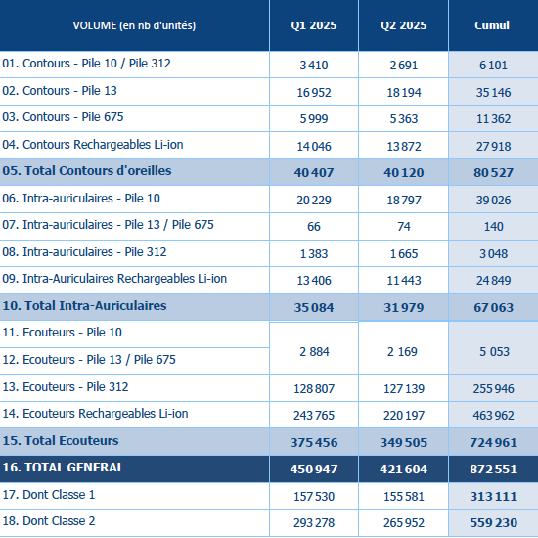 Les six industriels ayant répondu à l’enquête du Syndicat National de l’Industrie des Technologies Médicales (Snitem) annoncent avoir vendu 872 551 appareils aux audioprothésistes sur les 6 premiers de l’année 2025. Un chiffre en hausse de 6,5% comparé à la même période de 2024 (818 809). Du côté des contours d’oreilles, 80 527 unités ont été vendues, soit une hausse de 2,5% sur la période. Concernant les ventes d’intra-auriculaire, elles affichent 67 063 unités, un chiffre en hausse d’un peu plus de 10% au regard de 2024. Les écouteurs déportés représentent 724 961 unités vendues, soit une hausse de 6,7% (679 409 au premier semestre 2024). À noter que sur les 6 premiers mois de 2025 la part des ventes d’appareils en classe 1 a légèrement progressé pour s’établir à 35,8% contre 34,2% en 2024.